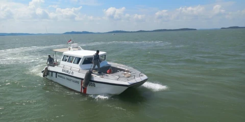 Bakamla RI yang tergabung dalam tim SAR gabungan melakukan pencarian 2 orang korban kapal Terbalik jenis Long Boat di Perairan Selat Nenek, Batam, Batam, Kamis (26/6/2025).