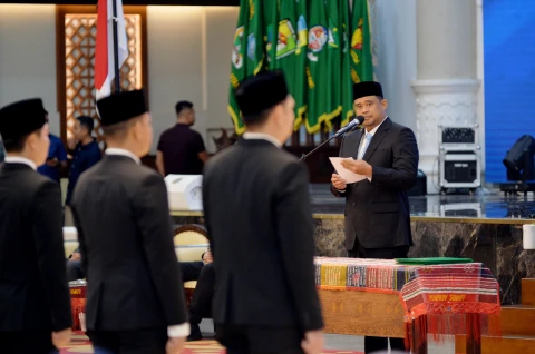 Bobby Nasution melantik dan melakukan pengambilan Sumpah Janji Jabatan sebanyak 60 orang pejabat administrator dan pengawas pada lingkungan Pemerintah Provinsi Sumut di Aula Raja Inal Siregar, Kantor Gubernur Sumut Jalan Diponegoro Kota Medan, Jumat (4/7).