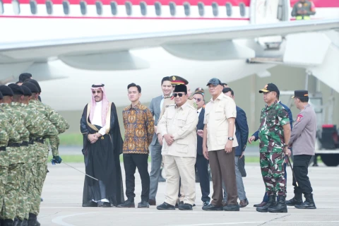 Panglima TNI Jenderal TNI Agus Subiyanto bersama beberapa Pejabat Negara mendampingi Presiden Republik Indonesia Prabowo Subianto meninjau latihan parade defile gabungan yang bertempat di skuadron 45 Halim Perdanakusuma, Jakarta, Selasa, (1/07/2025).