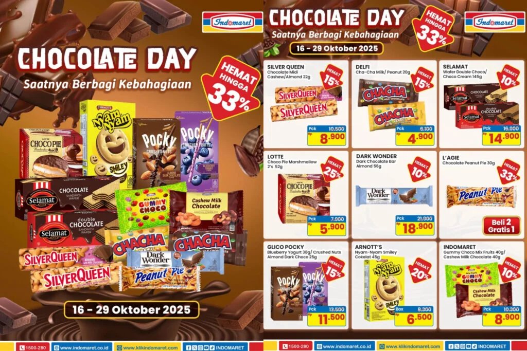 Promo ini akan berlaku mulai 16 hingga 29 Oktober 2025, menghadirkan beragam pilihan snack favorit Anda. Beberapa di antaranya adalah SilverQueen, Chaca, Wafer Double Chocolate, Lotte Choco Pie Marshmallow, Dark Wonder, L’-Agie Chocolate Peanut Pie, Glico Pocky, Arnott, dan coklat khas dari Indomaret sendiri.
