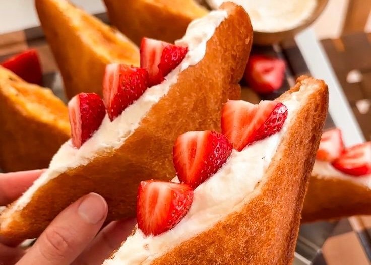 - Masukkan krim yang sudah jadi ke dalam potongan roti, lalu tambahkan buah-buahan sebagai topping sesuai selera.